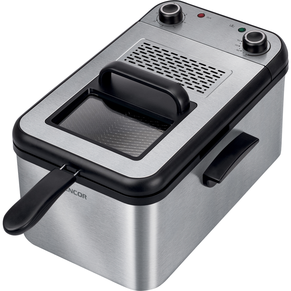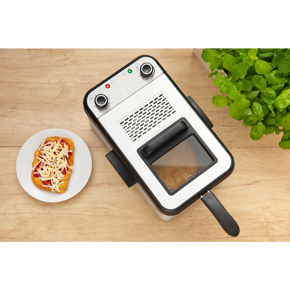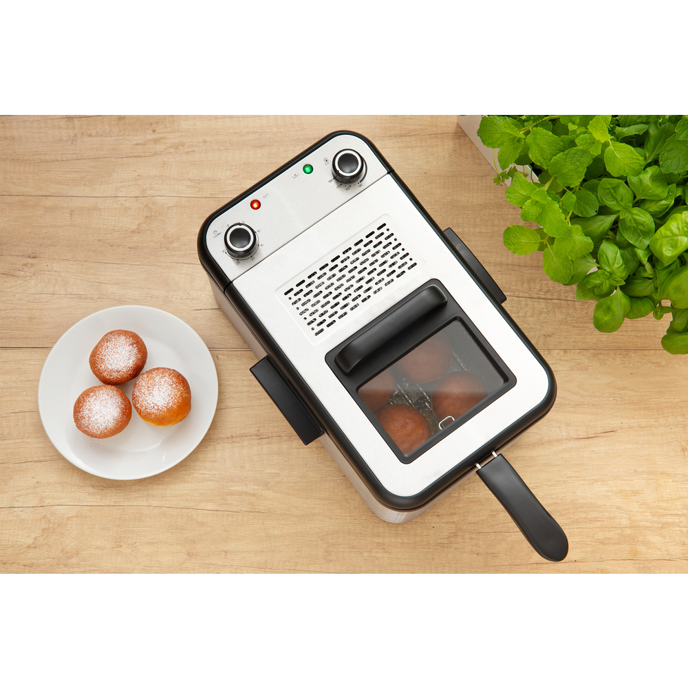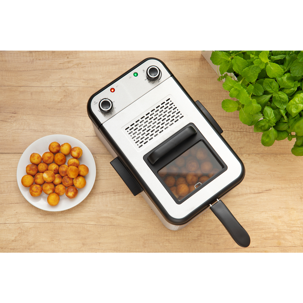 Fritezë për gatimin e patateve të skuqura me vëllim 3.2L të mjaftueshme për 1.4kg patate të skuqura. Ka kapak me dritare për kontroll të plotë të përgatitjes së ushqimit dhe termostat të rregullueshëm nga 130 °C në 190 °C me konsum të energjisë 2200W. Sipërfaqja e brendshme nuk është ngjitëse dhe ena ka trup dhe kapak inox. Ena e brendshme është e sigurt për enëlarëse, me dorezë të integruar për hapje të lehtë dhe dorezë të ndashme për ruajtje dhe pastrim të lehtë. Ena ka dorezë me sipërfaqe të ftohtë për përdorim të lehtë dhe drita treguese me kontroll mekanik. Ena ka mbrojtje nga mbinxehja dhe trup ngrohës të shkëputshëm për pastrim të lehtë me dorezë për trajtim të lehtë. Gjatësia e kabllos së rrymës është 1m.