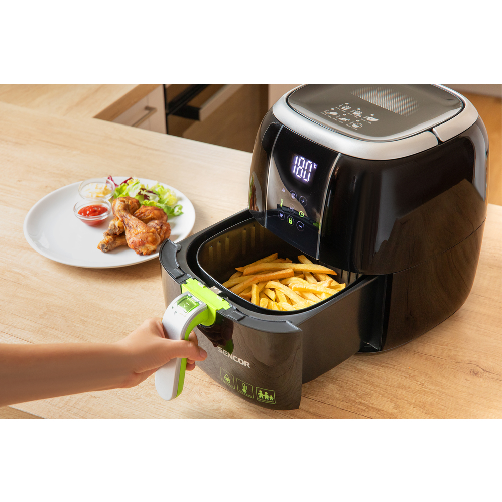 Me fritezën Sencor, mund të përgatisim ushqime të shijshme, të skuqura dhe jo të skuqura, pa pasur nevojë të shtoni një pikë yndyrë. Përdor teknologjinë e qarkullimit të ajrit të nxehtë dhe përgatit të gjitha vaktet në mënyrë të barabartë. Ushqimi juaj do të ketë shumë më pak kalori dhe kolesterol, kështu që nuk do të shqetësoheni për shëndetin tuaj. Friteza punon me gjashtë programe paraprake dhe përmes ekranit LED me prekje, mund të vendosni 6 programe automatike, një kohëmatës dhe temperaturën në intervalin 60 – 200°C. Kontrolli është plotësisht i qartë dhe intuitiv. Friteza mund të mbaj deri në 350 g ushqim me një pjatë për skuqje, që përmban një kapacitet prej 3L dhe mund të përgatisë pjata të shijshme, të tilla si patate të skuqura të freskëta, patate të bëra në shtëpi, perime, mish, chicken fingers, apo edhe ëmbëlsira. Energjia 1400 W, siguron përgatitjen e ushqimit të shpejtë dhe kjo fritezë ngrohet për 3 minuta dhe mund të përgatisni ushqim të shijshëm për 16 minuta. Një kohëmatës do të japë një alarm kur ushqimi është gati.