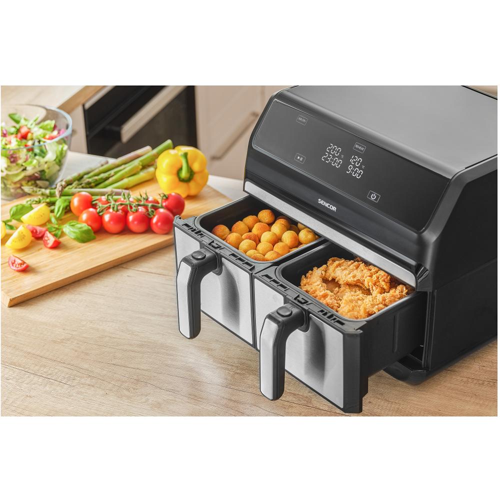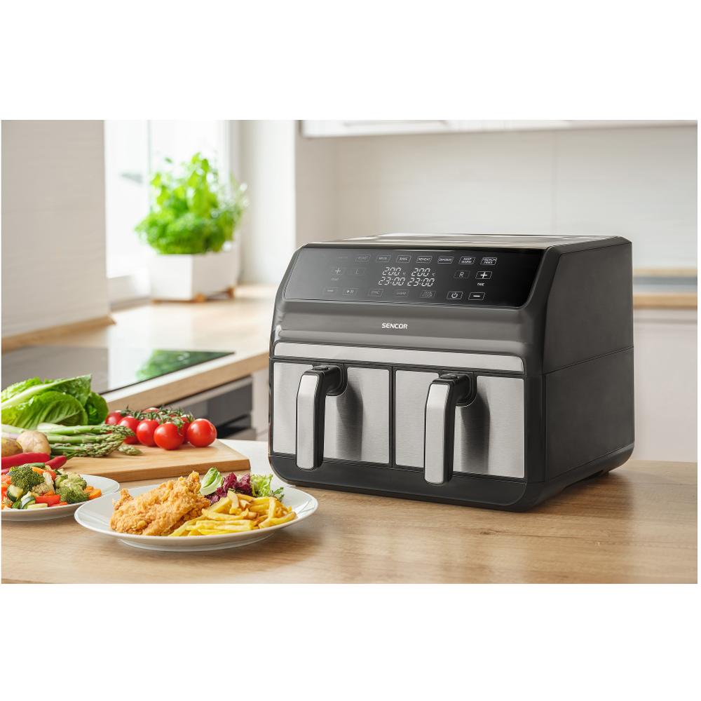 Kjo fritezë është alternativë e shëndetshme ndaj metodës tradicionale të skuqjes. Ajo siguron që nuk do të ketë vaj të djegur dhe bën reduktimin e erës. Ka kapacitet total 8 l , 2 enë nga 4 l dhe nxehet shumë shpejt, për 3 minuta. Posedon ekran LED dhe panel me kontroll me prekje. Ka 8 programe të ndryshme për përgatitjen e ushqimit dhe mundësinë e rregullimit të temperaturës 60°C – 200°C. Poashtu ka sistemin e posaçëm të qarkullimit të ajrit dhe erët e lëvizshëm për skuqje me sipërfaqe jo ngjitëse për pastrim të lehtë dhe mund të vendosen dy temperatura të ndryshme në të njëjtën kohë.