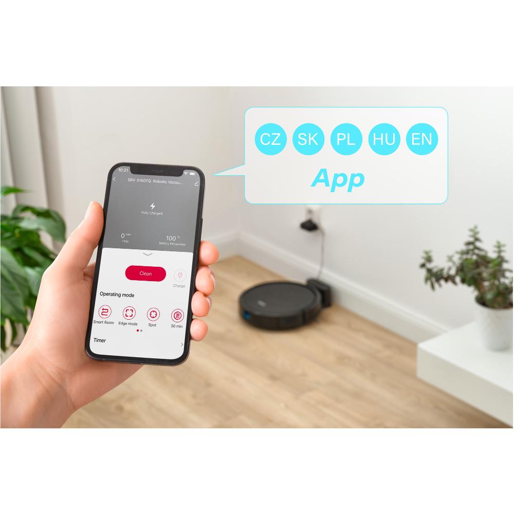 Nuk keni pse të shqetësoheni, nuk do të humbisni opsionin e konfigurimit të robotit përmes celularit. Me aplikacionin Sencor Home, mund të planifikoni pastrimin për një kohë dhe ditë të caktuar të javës, ose të aktivizoni modalitetin direkt nga puna ose shtëpia. Pajisja ofron 3 intensitete (thithje dhe fshirje), të cilat mund t’i vendosni edhe nga telekomanda.