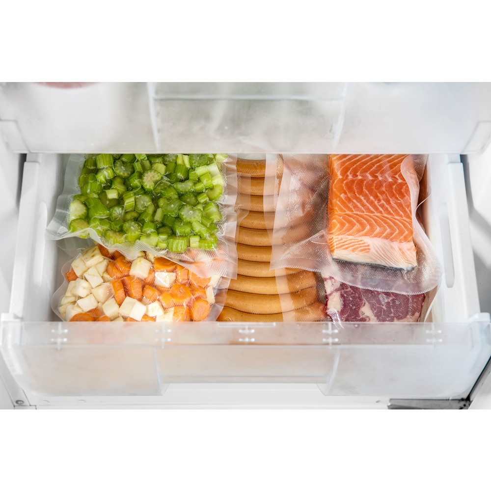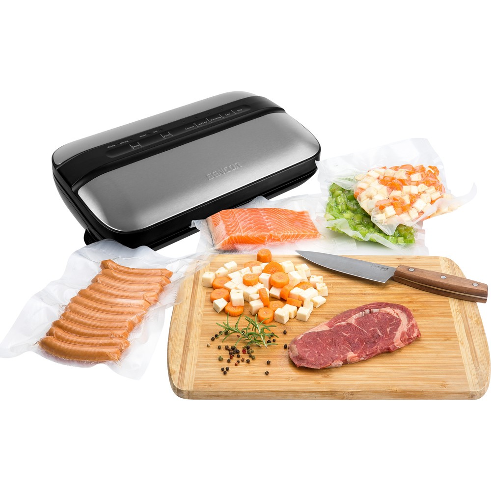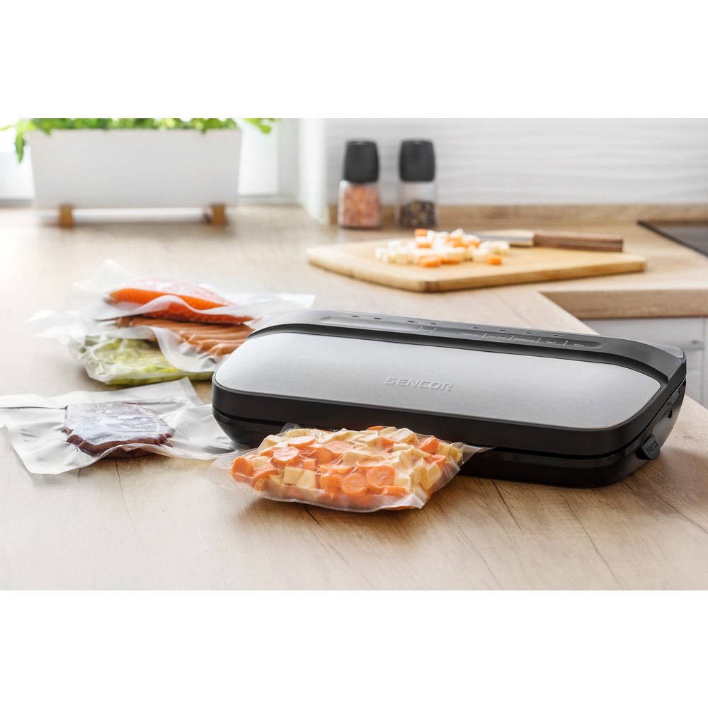 Me pajisjen për mbylljen e qeseve me vakum ju lehtë mund ta mbani ushqimin të freskët dhe me cilësi të mirë. Jetëgjatësia është deri në pesë herë më e gjatë dhe parandalon tharjen e ushqimit. Dizajni me një film të ruajtur brenda garanton komoditet maksimal të përdorimit. Këmbët kundër rrëshqitjes e mbajnë pajisjen fort në vend për punë të sigurt dhe mundësia e lidhjes së një tubi për thithjen e jashtme të kutive të vakumit, kanaçeve, shisheve etj. Tubi është i përfshirë në paketim dhe ne paketë përfshihet një grup bazë fletësh vakum profesionale. Dritat treguese LED, siguresa termike e kthyeshme e sigurisë për të parandaluar mbinxehjen. Ushqimi në qese mund të ngrohet dhe shkrihet