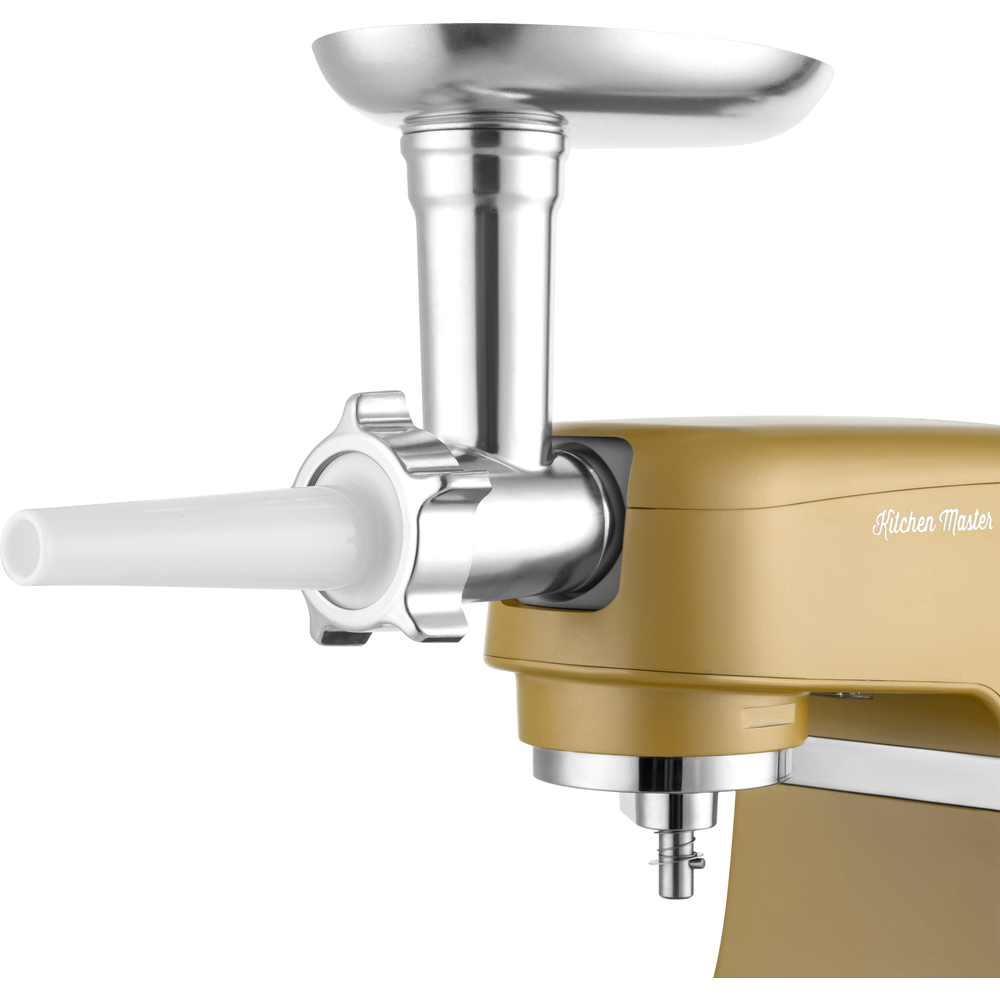 Mikser me një strehë të fortë metalike dhe transmision metalik ka një motor të fuqishëm 1000 W me një garanci 6 vjeçare. Shpejtësia e ndryshueshme ka 8 nivele dhe funksioni Smart Power and Energy ndihmon për të arritur shpejtësinë optimale. Falë sistemit të lëvizjes planetare, 4 aksesorët e ndërrueshëm sigurojnë përpunim të plotë dhe të barabartë të të gjithë përbërësve në enë gjatë përzierjes dhe shkumëzimit. Në një tas 4.5 litra, mund të përgatitni deri në 2.2 litra brumë ëmbëlsirash të lehta ose 0.8 litra brumë të trashë të rëndë në të njëjtën kohë ose të rrihni deri në 8 të bardha veze. Përzierësi i posaçëm FLEXI pastron me kujdes muret e tasit dhe i përzien dhe i shkumon përbërësit më shpejt dhe me efikasitet. Për lehtësinë e përdorimit, ekziston një tas inox me një shkallë matëse dhe ndriçohet duke ndezur dhe fikur automatikisht dritat LED. Kapakët plastikë janë të përfshirë për ruajtjen e ushqimit. Ekrani LED tregon kohën e kaluar pas fillimit dhe kohëmatësi ndihmon për të bërë brumin me një kohë të caktuar shkumëzimi. Mikseri ka një kapak me hapje që ju lejon të shtoni përbërës gjatë punës. Sistemi i fiksimit me bajonetë siguron zëvendësim të shpejtë të aksesorëve. Grirësja metalike ka disqe prerëse të këmbyeshme për shtypje të imët, të rregullt dhe të trashë dhe 2 gryka për mbushjen e salsiçeve ose për të përgatitur qebapa. Përveç kësaj mikseri ka një majë biskotash e cila ndihmon për të bërë biskota në katër forma të ndryshme. Për përgatitjen e ushqimeve dhe pijeve të ndryshme si smoothie, kokteje me qumësht, supa pure, salca dhe ushqime të freskëta për fëmijë, kompleti përfshin një enë përzierjeje me kapacitet 1.5 L, pa BPA dhe rezistente ndaj goditjeve Tritan. Këmbët që nuk rrëshqasin me thithëse sigurojnë përdorim të sigurt
