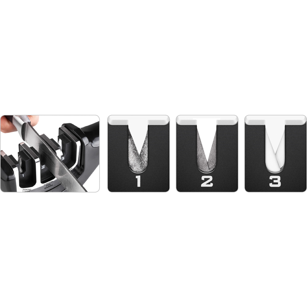 Mprehëse me 3 faza, bërë nga plastika e zbutur ABS. Disqet e mprehjes janë nga guri diamant për riparimin e tehut dhe ndreqjen përpara mprehjes, disku i pandryshkshëm prej tungsteni mpreh buzën dhe rikthen “formën V” në teh dhe guri qeramik grihet në teh dhe zbut të gjitha parregullsitë sipërfaqësore. Mirëmbajtja dhe pastrimi bëhen duke përdorur një leckë të lagur. Nuk është e mundur të zëvendësoni disqet mprehëse.