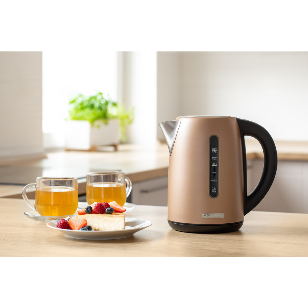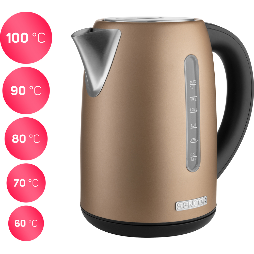 Vlues uji Sencor me kontroll të temperaturës dhe vëllim 1.7l nga materiali Çelik inox dhe ngjyre Shampanjë dizajni i të cilit përshtatet në mënyrë të përkryer në çdo shtëpi moderne. Ngrohja e ujit në temperaturën e zgjedhur:60-70-80-90-100 °C dhe funksioni i mirëmbajtjes së temperaturës për 120 min Grykë e projektuar posaçërisht për të parandaluar pikimin dhe derdhjen e ujit.Kapak i pajisur me bllokues sigurie për siguri maksimale Çelik inox SUS 304 me cilësi të lartë siguron qëndrueshmëri të gjatë Sistemi i sigurisë së trefishtë: