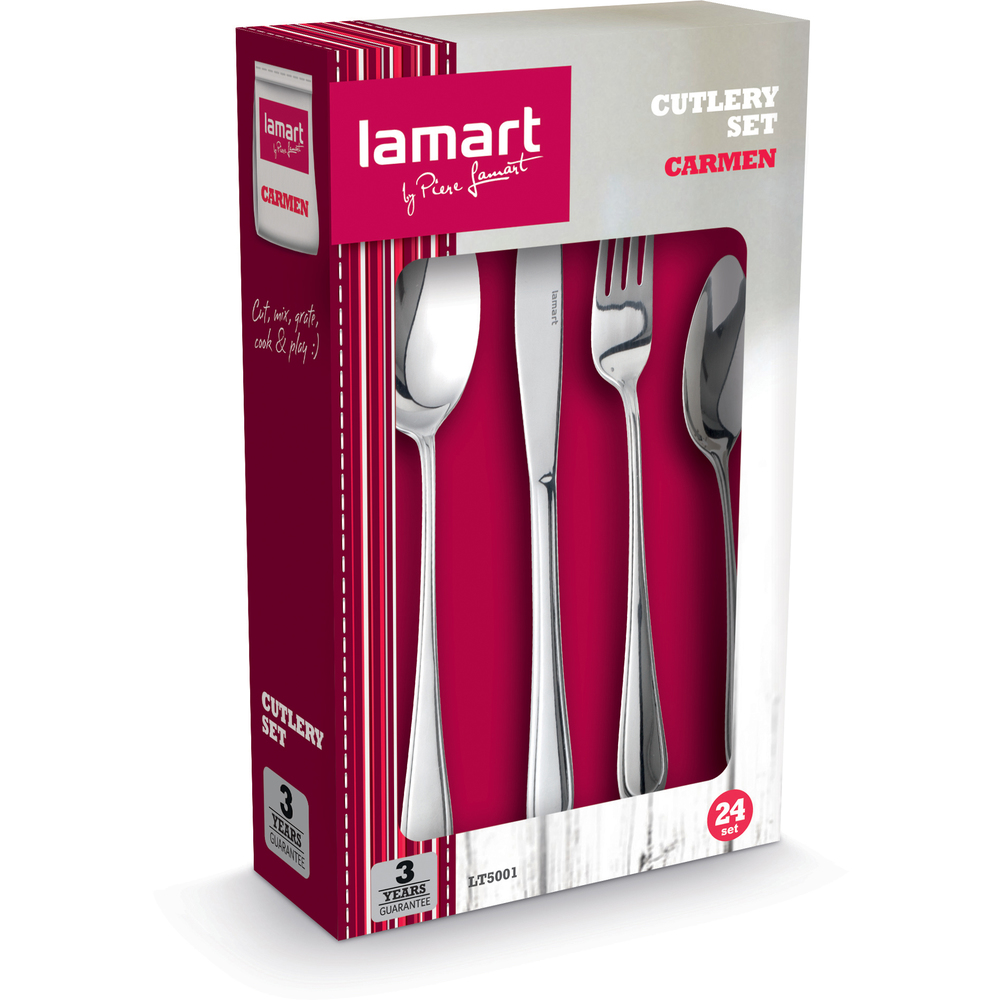 Set lugësh Carmen SS 24 copë. Bërë nga çelik inox i klasit të parë 18/10. Kjo seri shumë cilësore është për përdorim të përditshëm. Janë të sigurta për larje në pjatalarëse dhe fshijeni pas çdo larjeje.