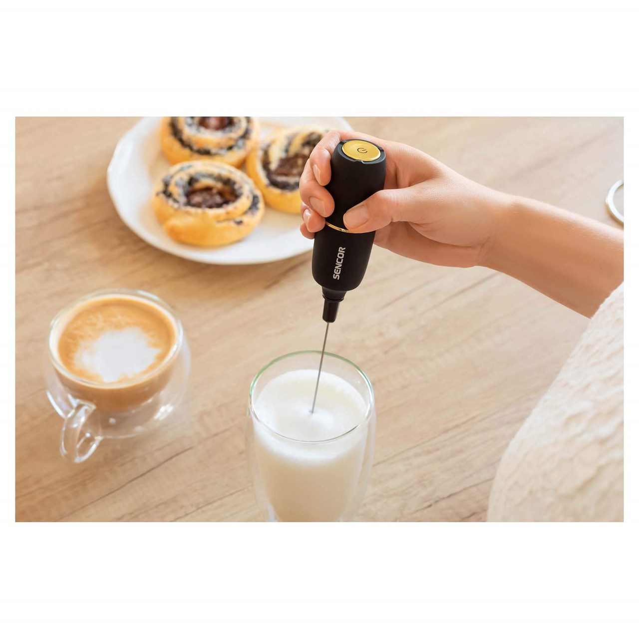 Bëni shkumë të pasur dhe kremoze në sekonda me këtë makinë për shkume. Prekje profesionale e përfundimit në Latte, kapuçino, makiato, çokollatë e nxehtë ose matcha latte. Përdorni këtë rrahëse prej çeliku inox për rezultate mbresëlënëse.
