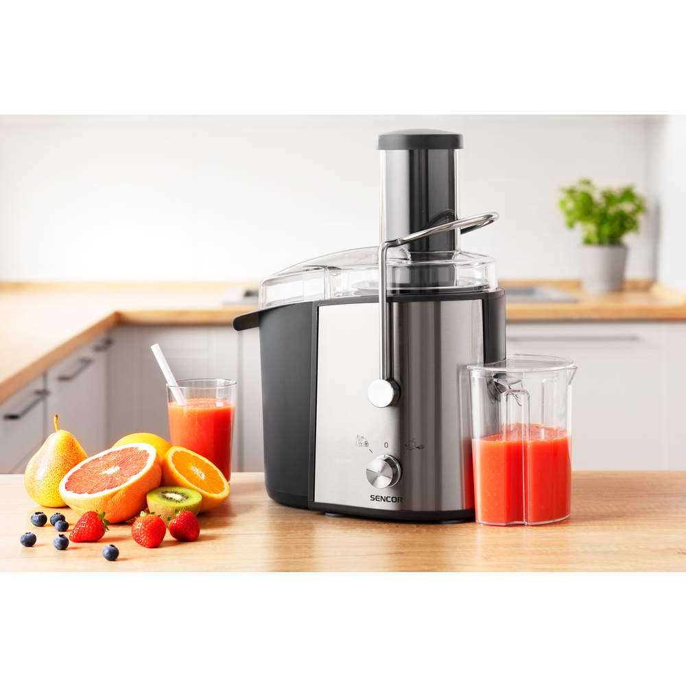 Shtrydhëse frutash nga Sencor me fuqi 800W. Ka dizajn çelik inox për mirëmbajtje të lehtë dhe higjienike, me ndarje automatike të tulit. Shtrydhësja ka 2 shpejtësi 10.600rpm dhe 12.600rpm dhe mund të përmbaj deri në 1.6L tul dhe ka një enë 0.75L për lëng. Ka një vrimë mbushëse prej 75mm dhe sistem të trefishtë të mbrojtjes për siguri të shtuar. Motori fillon vetëm nëse pajisja është e montuar siç duhet, ndalet kur hiqet kapaku dhe ndalet kur mbinxehet motori. Shtrydhësja ka edhe këmbë kundër rrëshqitjes për përdorim pa probleme dhe ka gjatësi të kabllos 1.2m. Ka përmasat 280x170x390mm me peshë 3.6kg.