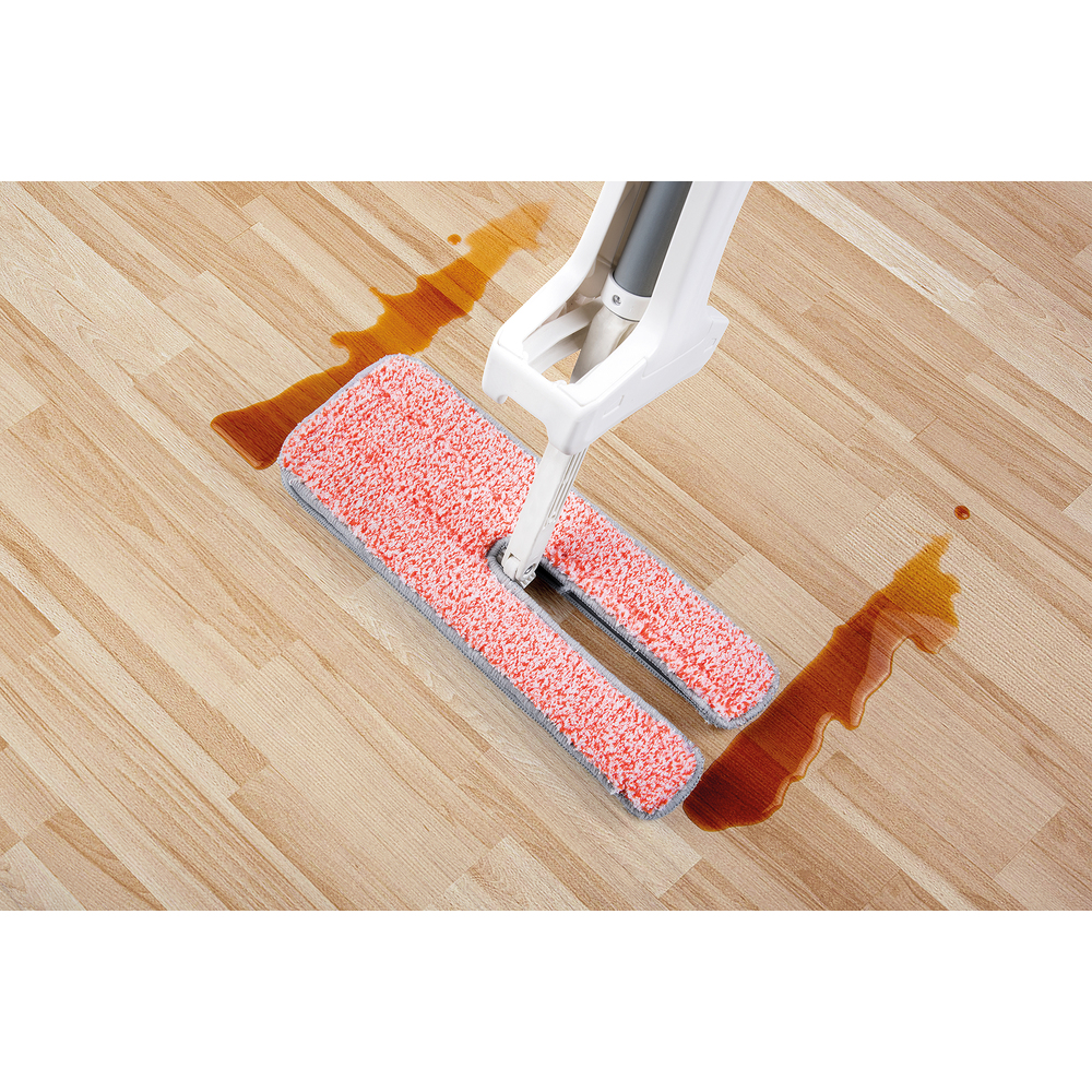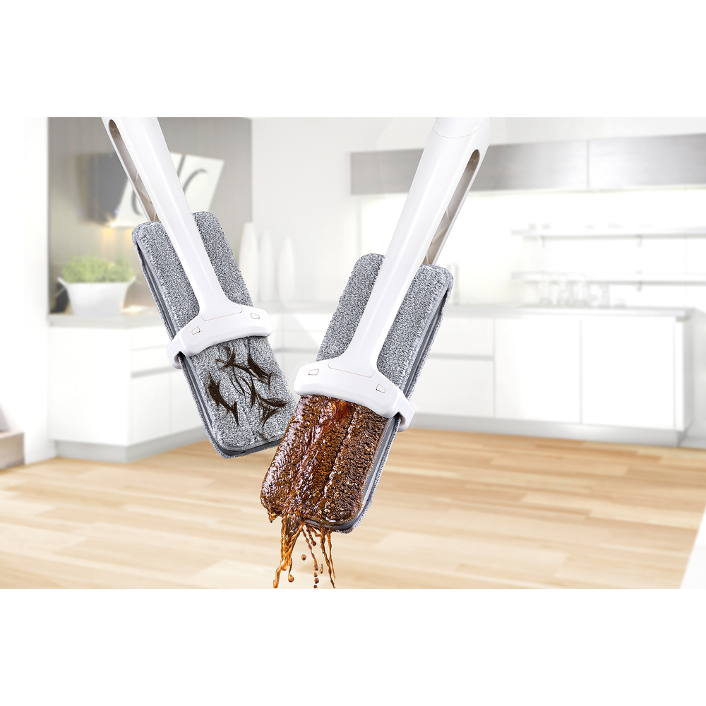 Pastrues i rrafshët 2 në 1 në një montim të kthyeshëm me dimensione 32 x 11 cm i bërë nga mikrofibra. Mikrofibra e dyfishtë përhapet në njërën anë për të pastruar përafërsisht papastërtitë dhe në anën tjetër për të pastruar imët dyshemetë duke përdorur metodën klasike. Pjesët mikrofibre që mund të lahen janë krijuar për larjen e duhur dhe fshirjen perfekte.