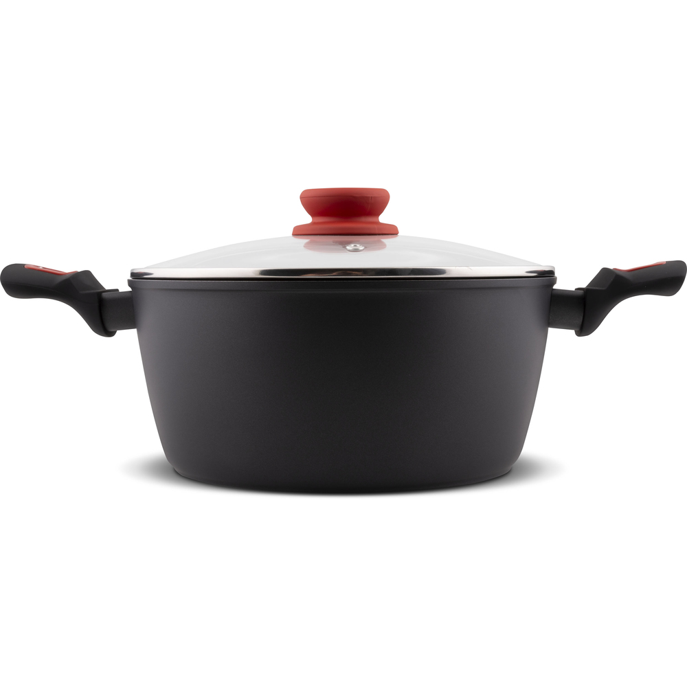 Bërë nga alumini shumë i qëndrueshëm me rezistencë të lartë kjo tenxhere është e pajisur me sipërfaqe jo adezive rezistente ndaj gërvishtjeve dhe djegies, doreza të trasha dhe doreza të formuara me një mbrojtje silikoni. Materiali jo-ngjitës pa PFOA (asnjë substancë toksike nuk avullohet në rast të mbinxehjes), është rezistent ndaj temperaturave të larta dhe parandalon djegien, që do të thotë gatim do të jetë më i shëndetshëm. Kapaku nga qelqi rezistent me një vrimë avulli dhe buzë silikoni siguron kontroll të përsosur të gatimit.