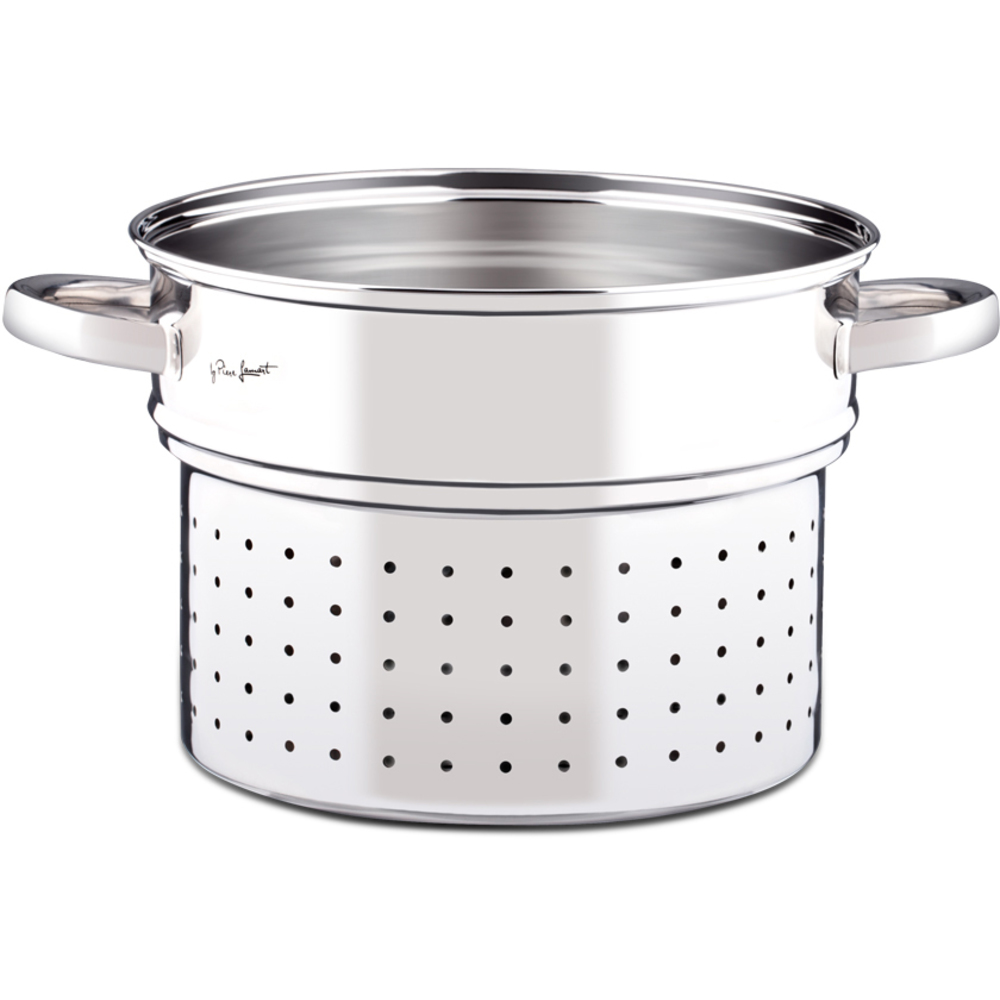 Kjo tenxhere nga çeliku inox është e pajisur me një fund që ka bazë të trashë. Tenxherja e brendshme e bërë nga çelik inox 18/10 shërben si shportë e avullit ose sitë dhe ka dorezat e veta komode për trajtim të pavarur. Ka një kapak nga xhami i qëndrueshëm me një dalje avulli për kontroll të saktë të gatimit dhe është i përshtatshëm për të gjitha llojet e pllakave të gatimit, përfshirë ato të induksionit.